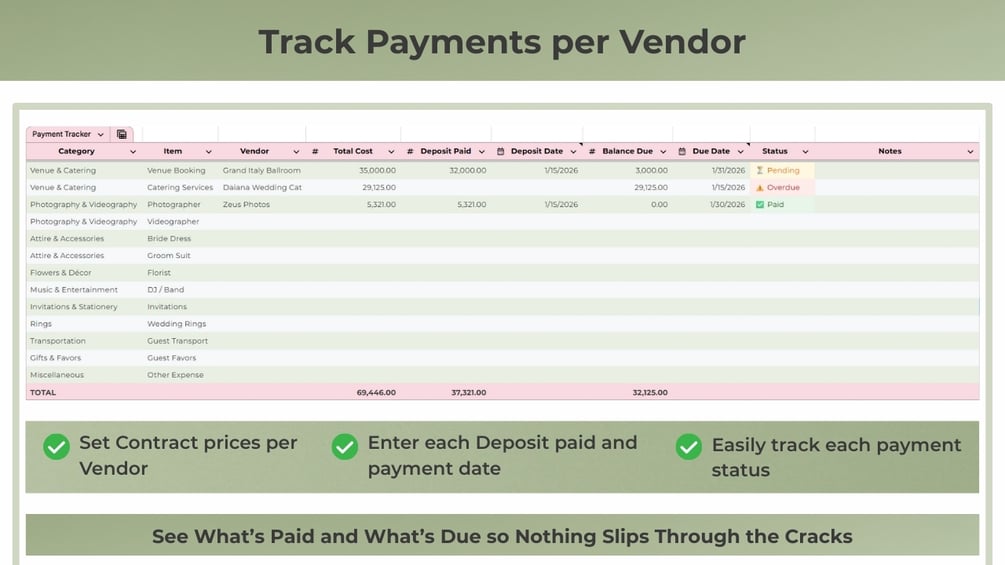 - Payment Tracker (deposits, balances, due dates, status)