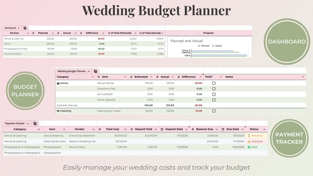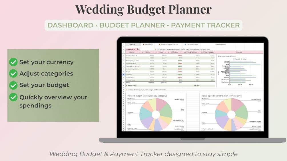 A simple wedding budget planner spreadsheet with dashboard and payment tracker. Works in Google Sheets & Excel. No overwhelm.