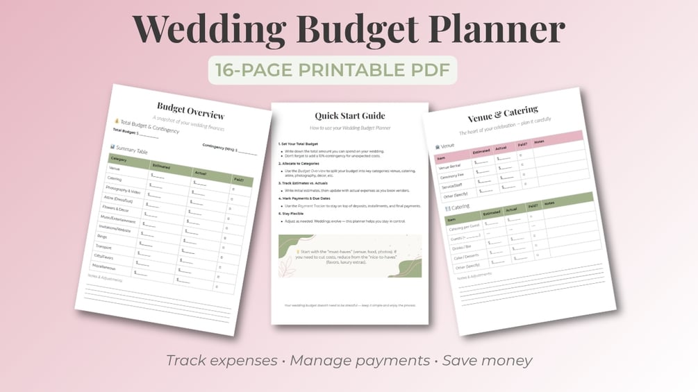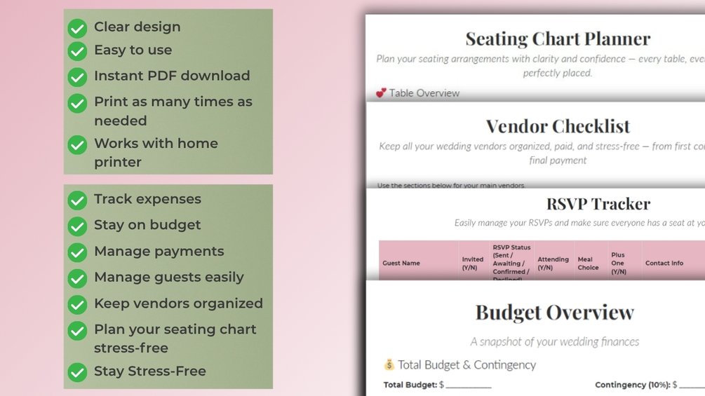 This Wedding Planning Bundle (4-in-1 PDF) includes everything you need to stay organized, track your budget, manage guests, and keep vendors on schedule.