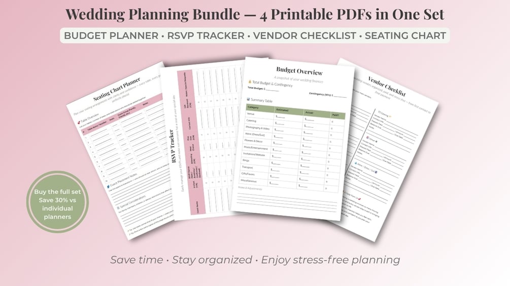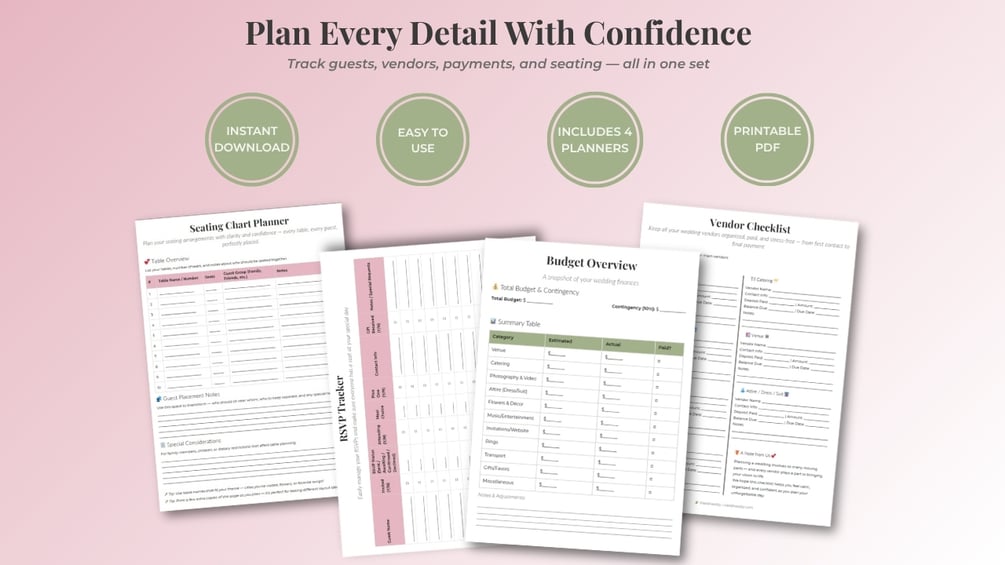 A complete 4-in-1 printable wedding planner bundle — includes a Budget Planner, RSVP Tracker, Vendor Checklist, and Seating Chart to help you stay organized and stress-free while planning your big day.